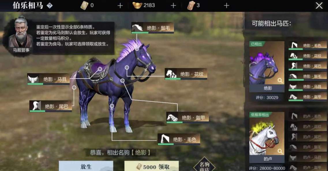 伯乐鉴定马匹后会显示6条特质,如果鉴定出劣马则会直接放生,但玩家可以获得一定积分返还。如果鉴定获得了良马,则玩家可以选择领取或者是放生。