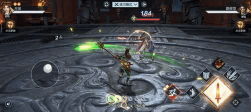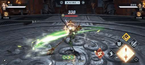 月英使用盘花棍进行挥击和扫击,对前方敌人造成一定伤害