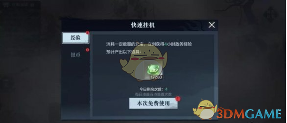 快速挂机顾名思义就是能够加速政务治理的过程,快速获取挂机收益。每天我们可以免费使用一次快速挂机功能,立刻获得4小时的政务经验或者银币收益,后续次数则可以通过消耗元宝使用。