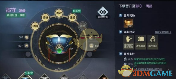 想要获得更高的政务收益,快速提升官职是必要的。小霸王们点开官职界面后,即可看到右下角的晋升条件,完成每级所要求的任务后,即可通过册封来提升官职。