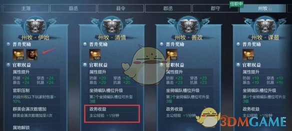 当小霸王们晋升下一级官职时,除了能够加成政务收益,还将会获得道具、权益以及属性三方面的奖励。
