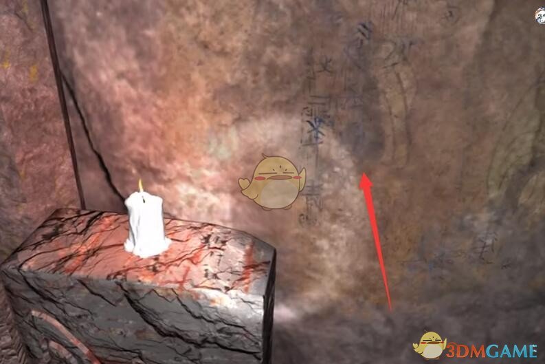 位置:一直往前走到山洞最里面,查看周围的墙壁,点击如图位置得到线索。