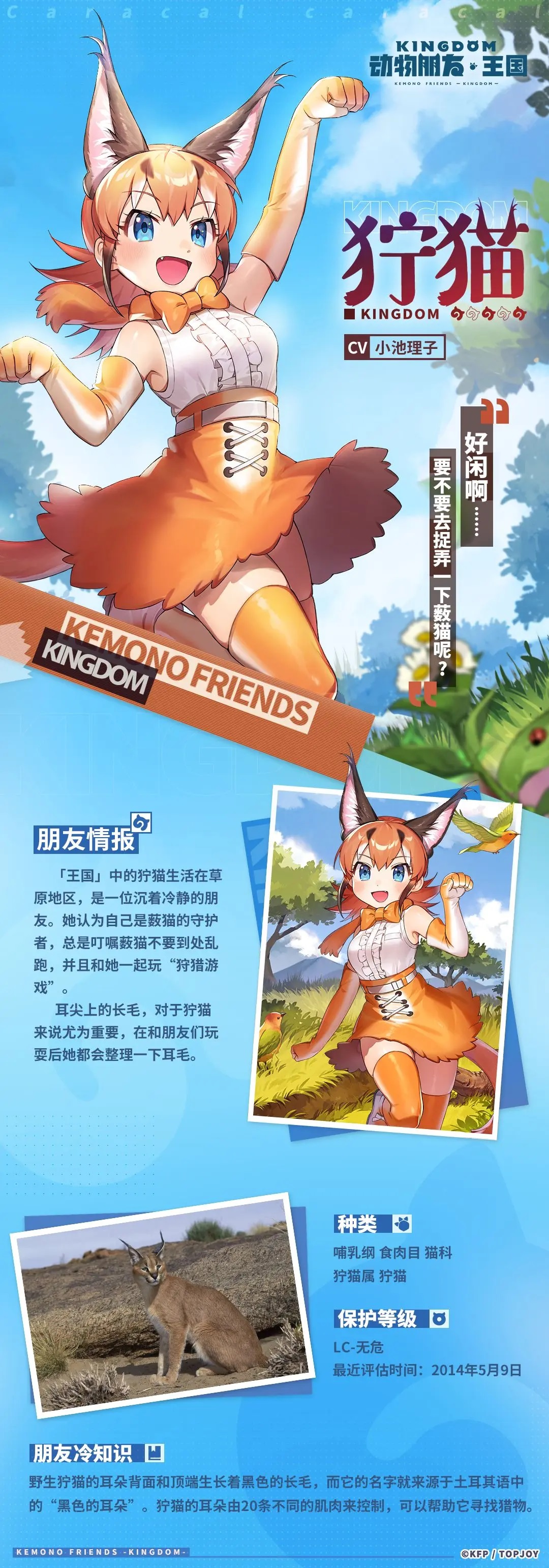「王国」中的狞猫生活在草原地区,是一位沉着冷静的朋友。她认为自己是薮猫的守护者,总是叮嘱薮猫不要到处乱跑,并且和她起玩狩猎游戏。