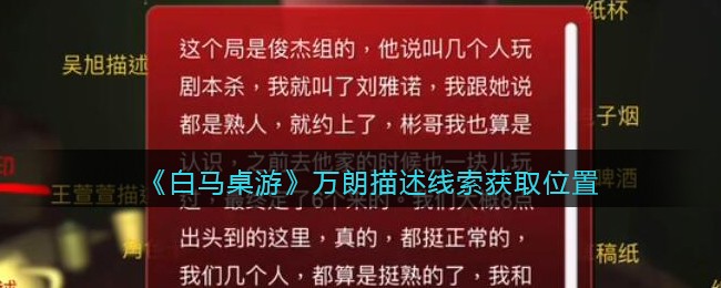以上就是小编整理带来的《孙美琪疑案:白马桌游》万朗描述线索获取位置,大家还喜欢吗?更多精彩内容,请点击关注易采游戏网,小编将持续为您更新!