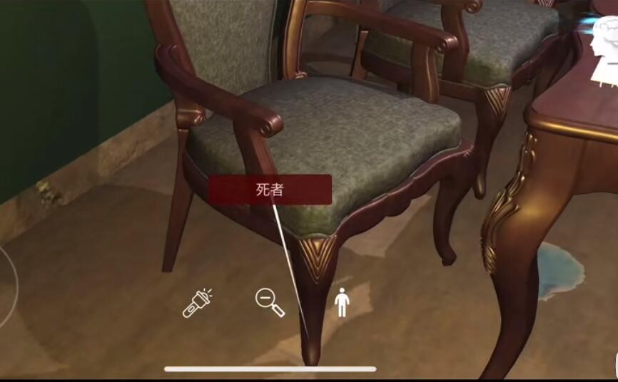 位置:如图,出生地转动视角后点击图中椅子处获取线索。就是有水迹的椅子这里。