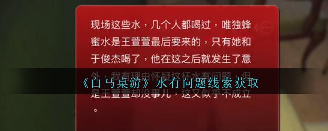 以上就是小编整理带来的《孙美琪疑案:白马桌游》水有问题线索获取位置,大家还喜欢吗?更多精彩内容,请点击关注易采游戏网,小编将持续为您更新!