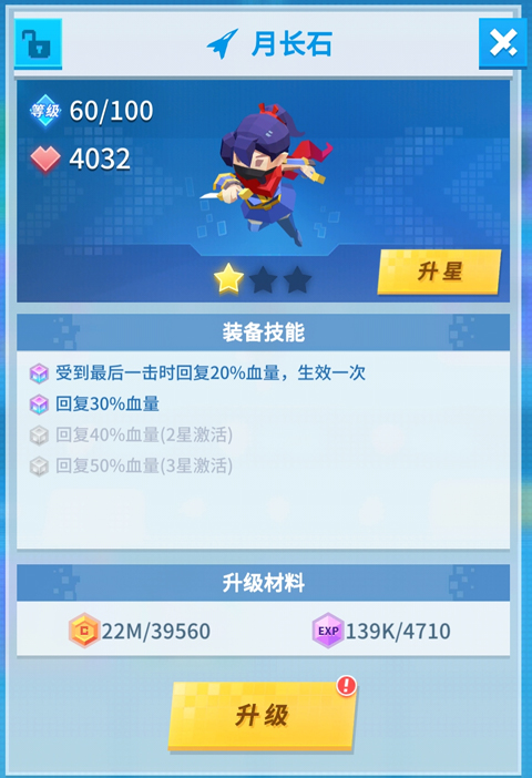 不同的战机除了拥特色的外观,越高的品质带来的装备技能也越好。今天的主角——月长石就是一款蓝色品质的战机。女忍者挂导弹的形象怎么都觉得有几分舰娘(机娘)既视感。虽然月长石所携带的重生技能不如竹骑士的“满血复活”那么强力,但能够回复最多50%的血量依旧相当可观。