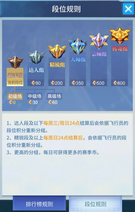 达人段及以下每周三和周日24点结算,并依据段位积分重新分组,精锐段及以上每周日24点结算并重新分组。分组越高获得的赛季币更多。