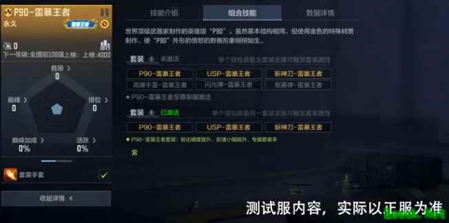 同时,集齐套装还有专属的“射击精度提升、射速小幅提升、专属套装手套”属性,集齐套装后的P90-雷暴王者不单能在生化模式中展露锋芒,更能在竞技模式里大放异彩。