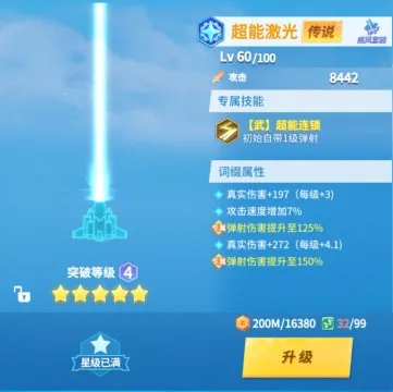升级后,超能激光变成两束紫色激光,而它的弹射技能也更加炫酷,像镜面反射一样,每碰到一个敌人,都会向其他方向的敌人弹射。
