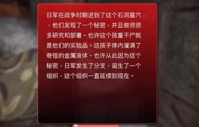 日军在战争时期进到了这个石洞墓穴,他们发现了一个秘密,并且做很很多研究和部署。也许这个孩童干尸就是他们的实验品。这孩子体内灌满了奇怪的金属液体。也许从此因为这个秘密,日军发生了分支,诞生了一个组织,这个组织一直延续到现在。