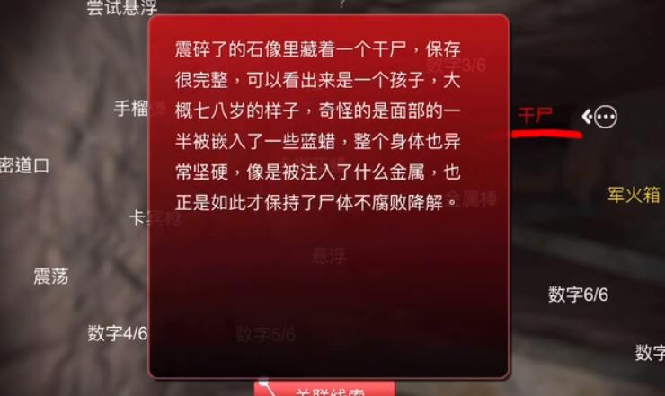 将金属棒直接放到悬浮杯上,发生爆炸,然后在旁边可以看到一句干尸,点击获取线索。