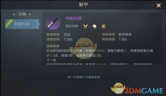 四面汉剑适用与所用兵种,是一个主动对敌单体技能的宝物。可以对当前目标造成智力伤害(伤害率150%,受智力影响),并使目标智力减少7.5点,持续6秒,该效果可叠加3次。