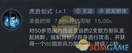 虎贲剑式为主动对敌群体技能,对50步范围内由近及远的2支敌方部队发起挑衅,强制目标对自身进行攻击,并获得一个80固定兵力的护盾,持续7.5秒。