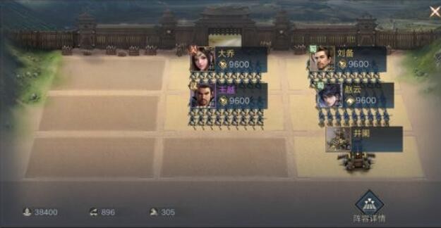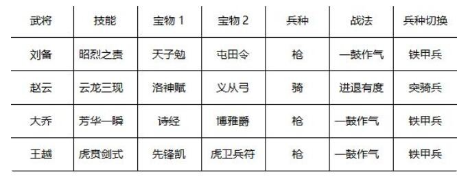 本队主要是以刘备为核心进行搭配,总体思路来源于底损开荒。队伍的主要输出点在赵云身上,王越和大乔的武将选择相对灵活,本队推荐选择大乔和王越主要有两方面原因,一方面作为一队开荒队,统御值低才能在前期发挥更大的作用,快速练级获得更多资源,当别人还在调整主力队时这队等级已经快满级了。另一方面选择三个枪兵组成的队伍,在对抗当前版本的四骑时有奇效。打到后期,大乔换孙权,也是对四骑有着极大的威胁。