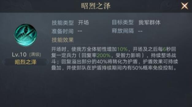 刘备的自带技能昭烈之泽,开场时使我方全体韧性增加10%,开场以后每6秒回复200%的兵力,并且溢出的40%治疗会转化成护盾可持续叠加,在护盾持续期间有50%概率免疫控制。不光是开荒,打架这个技能也能大幅度降低队伍战损,要想打架得过就要先能站得住。天子冕和屯田令也能大幅提升刘备的生存能力,基本上打完一场架下来刘备奶量都是1w以上。