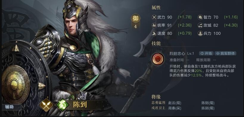 以上就是小编整理带来的《荣耀新三国》手游陈到技能属性图鉴,大家还喜欢吗?更多精彩内容,请点击关注手游网,小编将持续为您更新!