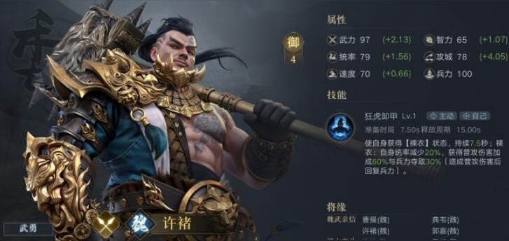 御值4御,获得裸衣状态,持续7.5秒,间隔15秒。使自身统率减少,普攻伤害增加兵造成兵力夺取效果。