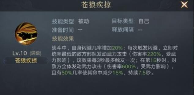 战斗中,自身闪避几率增加20%;每次触发闪避,立即对统率最低的敌方部队发动武力攻击,每3秒触发一次;第15秒时,对敌方全体发动武力攻击,且有50%几率使其命中减少15%,持续7.5秒。在技能的选择上以闪避,全体加BUFF为主