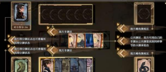 玩家通关第三章后即可解锁千秋戏。玩家开局双方各自获得10张手牌,公告卡池汇总有8张手牌,使用手中的卡牌去对应公共卡池的卡牌,即可获得积分。