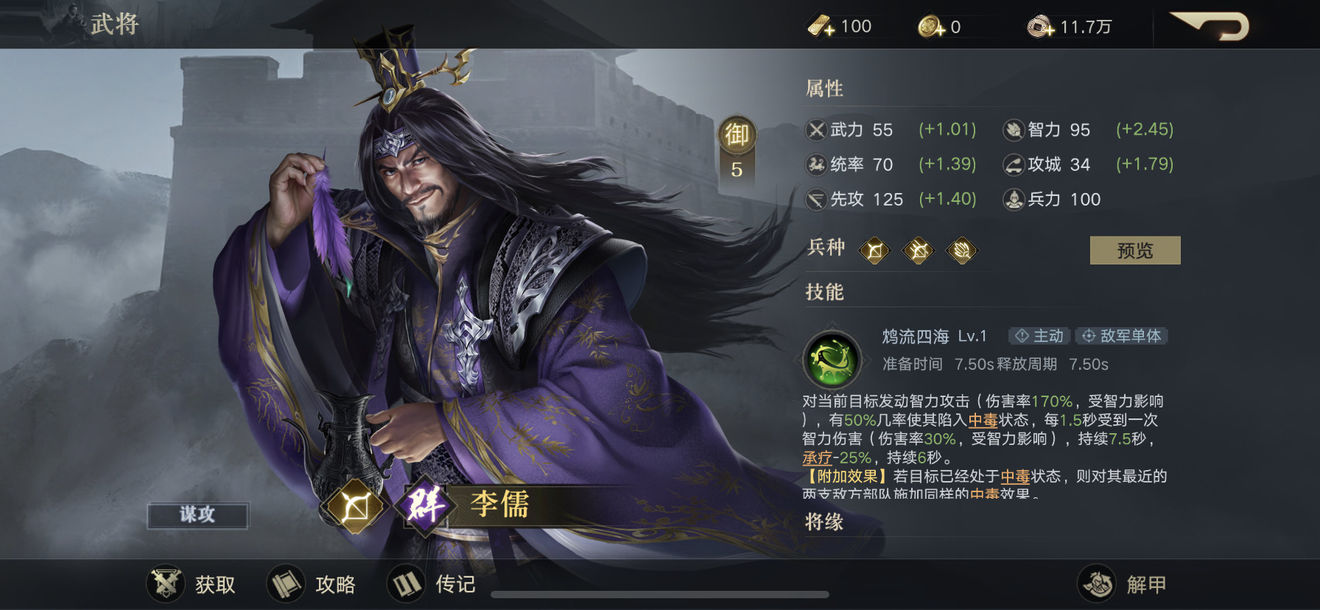 中规中矩的谋士角色,但技能中毒可以开发搭配。