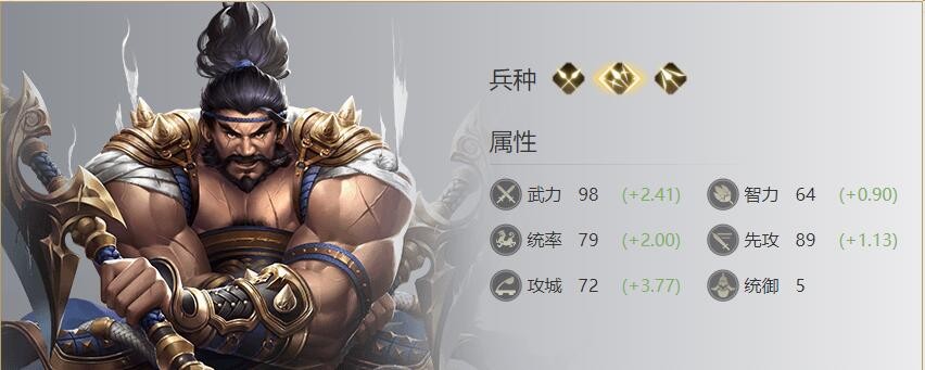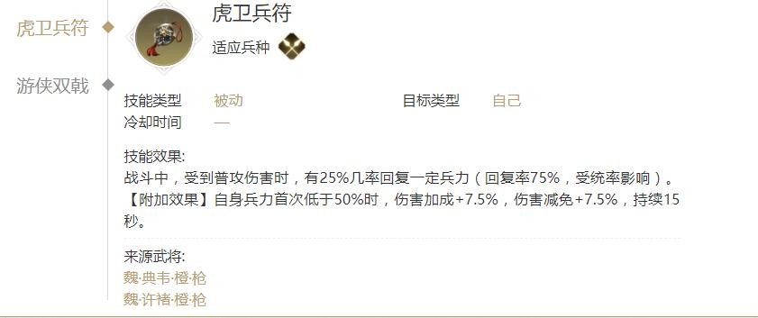 战斗中,受到普攻伤害时,有25%几率回复一定兵力(回复率75%,受统率影响)。【附加效果】自身兵力首次低于50%时,伤害加成+7.5%,伤害减免+7.5%,持续15秒。