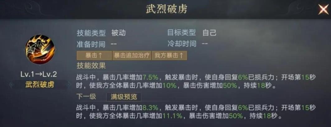 不难看出他的技能等级提升带来的是暴击率的增加,而自身回复兵力的效果以及15秒后的暴伤加成是恒定不变的,同时这两项数据都很可观。