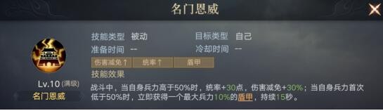 首先是兵力高于50%时给到的统率效果加成以及伤害减免十分可观,而低于50%后的盾甲,让袁绍能够在队伍里有医治型武将时将血线重新拉回50%以上再次触发统率加成以及伤害减免效果。