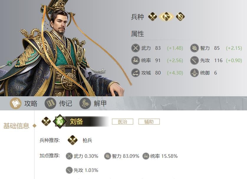 刘备:技能属性图鉴| 宝物推荐| 阵容推荐 | 加点培养攻略