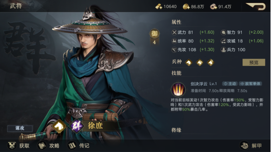 然后再就是拥有双属性输出的徐庶,虽然输出能力不强但是胜在全面,且技能附带的暴击率配合合适的宝物能够让他的输出能力也变得比较可观。