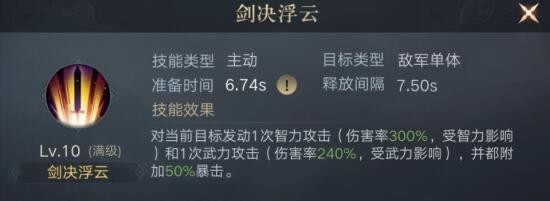 所以正如主公们所见,他的技能[剑决浮云]同时可以对敌方造成武力以及智力两种伤害,并且自带暴击效果。
