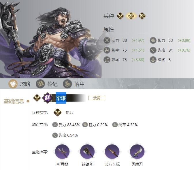 荣耀新三国游戏中华雄加点推荐:武力 88.45%;智力 0.29%;统率 4.32%;先攻 6.94%。兵种推荐:枪兵。宝物推荐:新月戟、镔铁斧、丈八长标、凤嘴刀。