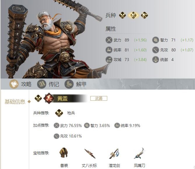 荣耀新三国中黄盖是吴国将领之一,也是苦肉计的主角和赤壁之战的亲历者,他比较适合优先武力值加点,加点推荐:武力 76.55% 、智力 3.65%、统率 9.19%、先攻 10.61%。