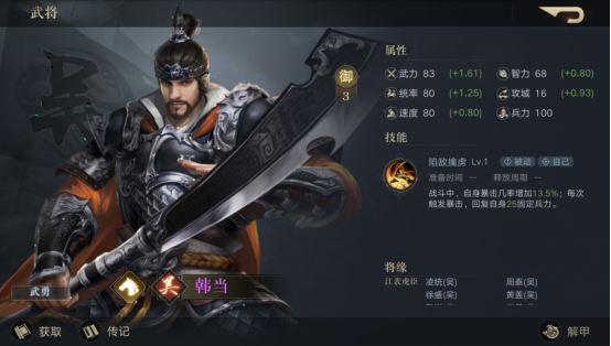 韩当是个纯粹的暴力输出型武将,基础属性虽然不如高御的武将,但是在前期还是能够支撑得起队伍的输出任务的。
