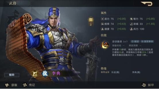 除此外,还可以尝试乐进+李典+貂蝉的阵容,这样子在中期还没有入手吕布、吕姬时,第四位武将可以选择魏国的武将,方便后面替换成甄宓。