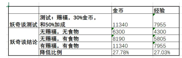 目前妖奇谈的赐福是50%经验和50%的金币加成,食物加成是金币30%,经验35%。