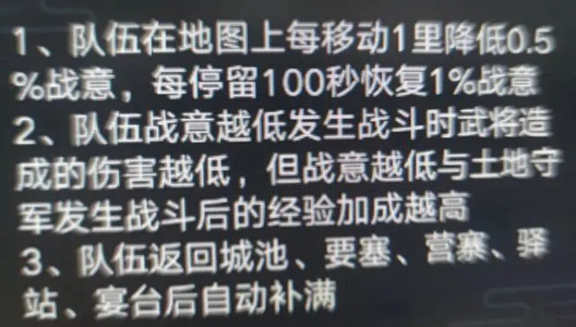 战意为0的时候,战斗力会削减60%,剩余40%的战斗力,但战意为110%也只会发挥百分之一百的实力。
