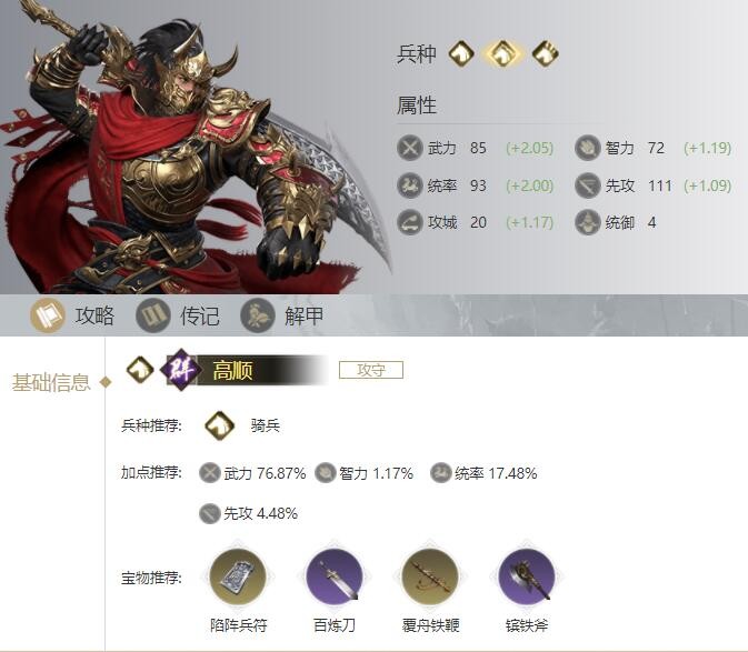 荣耀新三国游戏中高顺加点推荐:武力 76.87%、智力 1.17% 、统率 17.48% 、先攻 4.48%。宝物推荐:陷阵兵符、百炼刀、覆舟铁鞭、镔铁斧。
