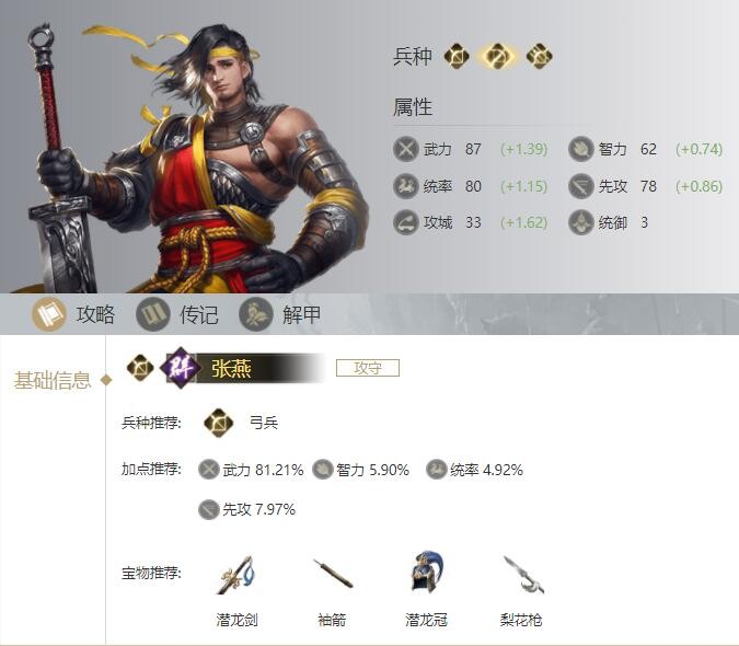 荣耀新三国游戏中张燕加点推荐:武力 81.21%、智力 5.90%、统率 4.92%、先攻 7.97%。兵种推荐:弓兵。宝物推荐:潜龙剑、袖箭、潜龙冠、梨花枪。