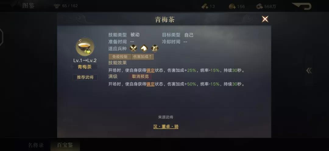 并且青梅茶提供的不只是30s免疫控制,还有50%的伤害加成。当然青梅茶会降低装配武将的统率,如果对方也有打击后排的能力尽量避免使用。