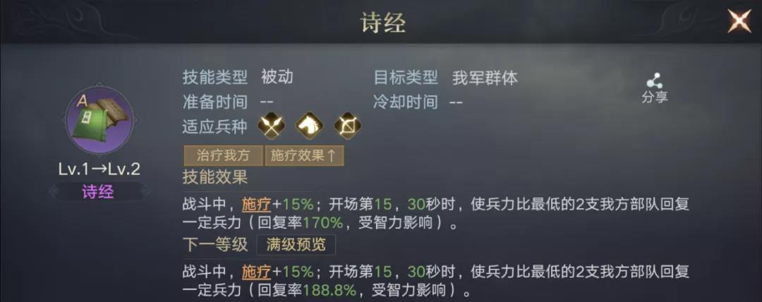 诗经的回复率相较伯雅爵低了一些,但是它能够给到两支己方兵力最低队伍一定的回复,并且15%施疗效果提升还可以提升伯雅爵一定的回复量。