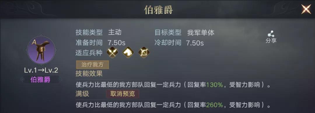 伯雅爵的技能为较高额的兵力回复,它是可以单独给到回复的,所以并不强制一定要装备在医治型的武将身上。但最好确保所装配武将拥有较高的智力,能够给到更高的回复量。