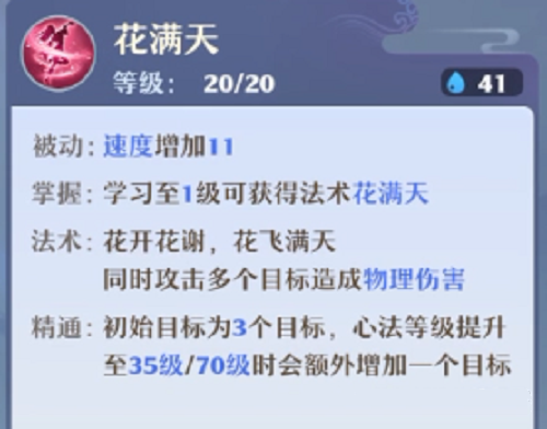 (2)花满天,被动增加人物速度,这是合欢唯一的主动伤害性法术。需要注意的是造成物理伤害,基本上只有PVE活动挂机的时候使用,PVP基本没有出此招的机会,最多秒5。