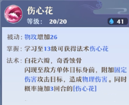(3)伤心花,被动增加人物物攻,合欢使用率最高的控制性辅助技能。心细的宝贝应该已经发现了这个技能和长生两仪混元的区别了,伤心花虽然只封印了法术,但同时可以降低对手双防,还能造成固定伤害!除了万毒被封了还能普攻砍砍人以外,其他门派甚至是鬼王都会觉得憋屈的。