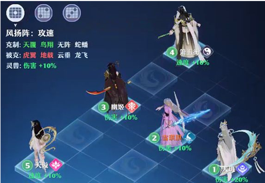 每次到了限时的PVP活动,总能在世界或队伍频道看到这样的发言,说明风扬阵人气还是挺高的,1号位+20%伤害,2~3号位及灵兽位+10%伤害,4和5号位+10%速度。