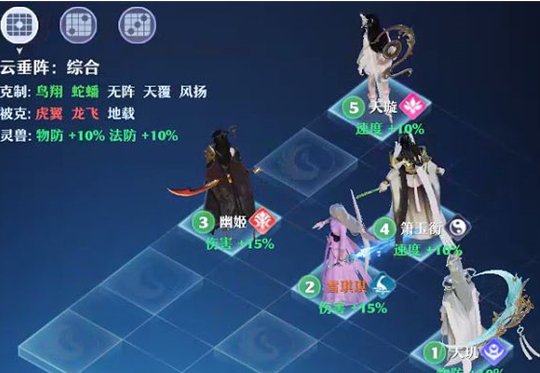 当前版本第一万金油阵型前来报到。4和5号位速度+10%,2和3号位伤害+15%,1号位和灵兽位双防+10%。PVP敏队的克星,尤其是鸟翔阵看了就落泪,本来输出就不高的情况下还被云垂阵大克,打不动灵兽也打不动辅助位。