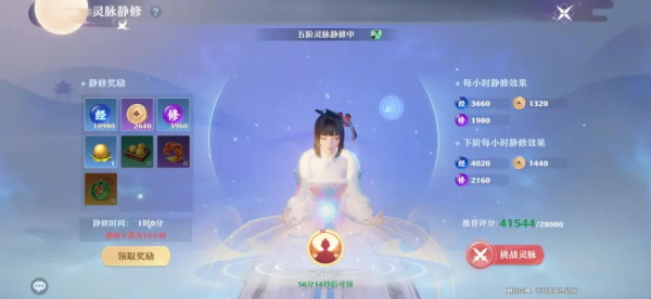 挂机养成,无论角色是否在线都可获得灵气奖励,奖励上限12小时,记得及时领取奖励、通过挑战灵脉可提升静修效果。