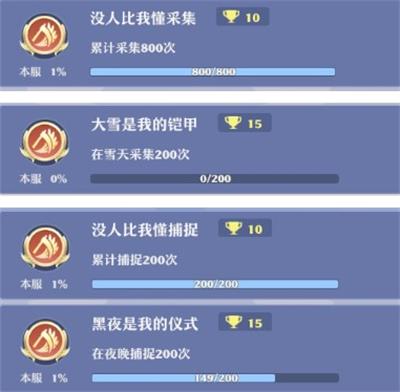 时间长了采集800次和捕捉200次成就都可以完成。因为雪天太难遇到了,所以采集不建议硬等雪天才去做,但是捕捉可以选择夜晚去捕捉,顺便还能把夜晚的200次做了。共65点成就。