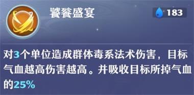 我们来主要看看饕餮的伤害技能——【饕餮盛宴】,对3个单位造成群体毒系伤害,目标气血越高伤害越高,并吸收目标所掉气血的25%。乖乖!三个细节: