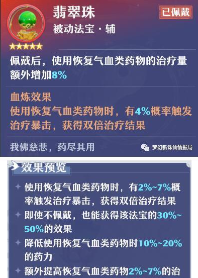 法宝翡翠珠是目前除了天音和南疆外,其他门派中最适合放在辅位的被动法宝,当然如果天音南疆没获得【玲珑石】的话,还是佩戴翡翠珠最合适。